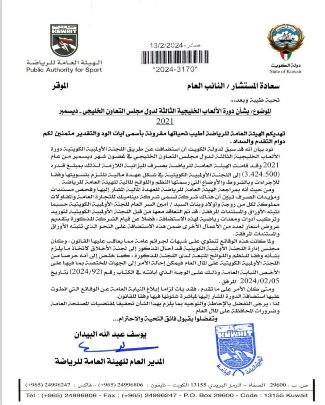 Al-Musallam is said to have awarded a part of this sum, which was provided from state funds for the third Gulf Games in December 2021, to the company Dynamic General Trading & Contracting, which is – according to the authorities – owned by members of his family.